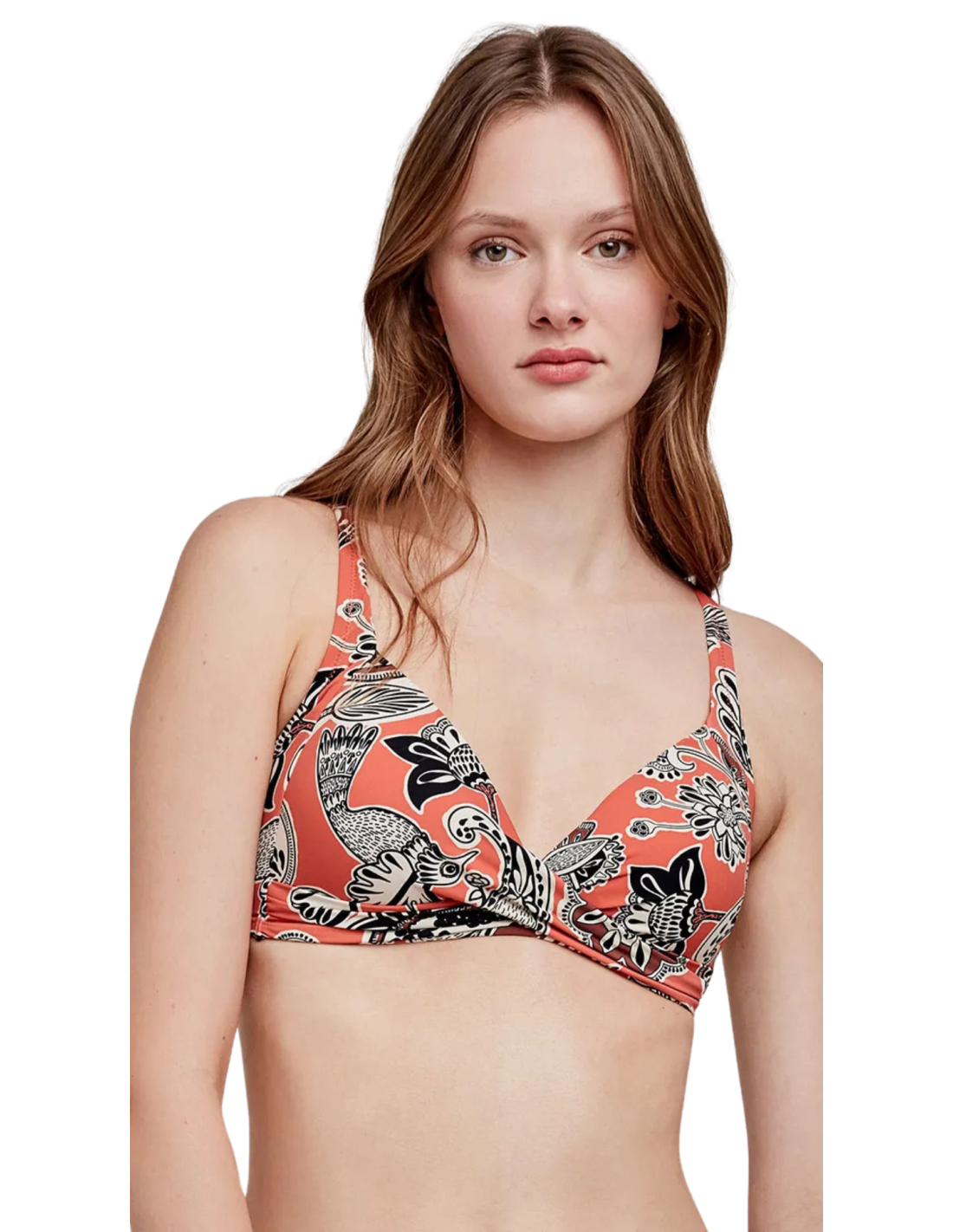 Il colore Fantasia Corallo aggiunge un tocco di freschezza e vitalità al tuo look da spiaggia, mentre la coppa senza ferretto garantisce un supporto ottimale e un comfort duraturo. Indossalo con fiducia e lasciati ammaliare dall'atmosfera mediterranea che trasmette.
